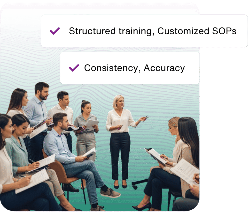 Empower your internal team with structured training, customized SOPs, and documentation that ensures consistency, accuracy, and operational continuity.